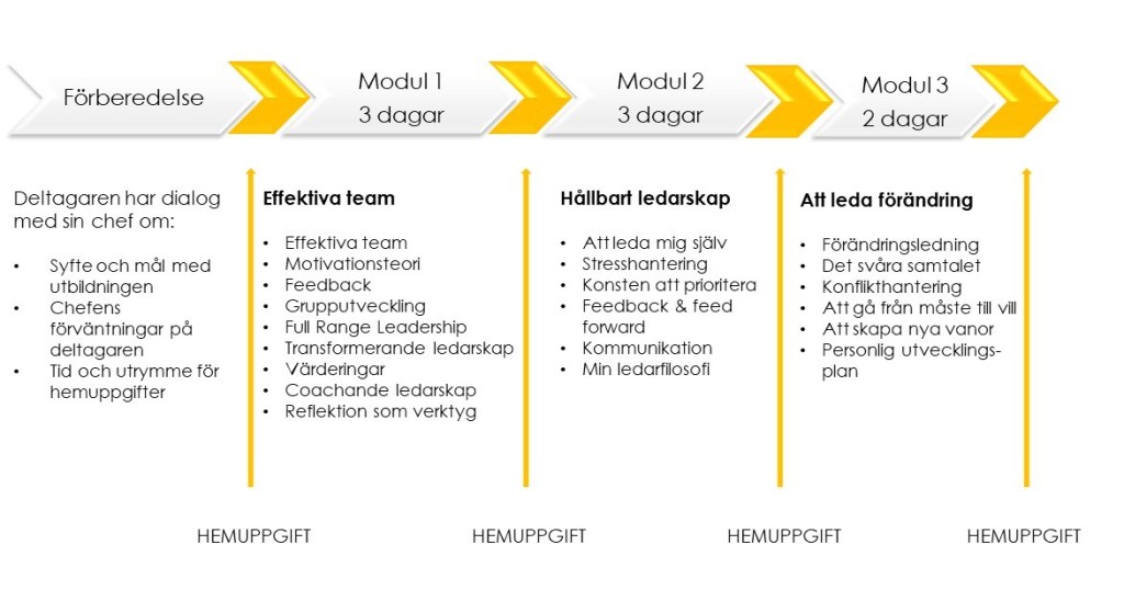 Bilden nedan beskriver grundupplägget för utbildningen Hållbart ledarskap. Utbildningen omfattar åtta heldagar uppdelat på tre moduler med cirka två månader mellan modulerna.